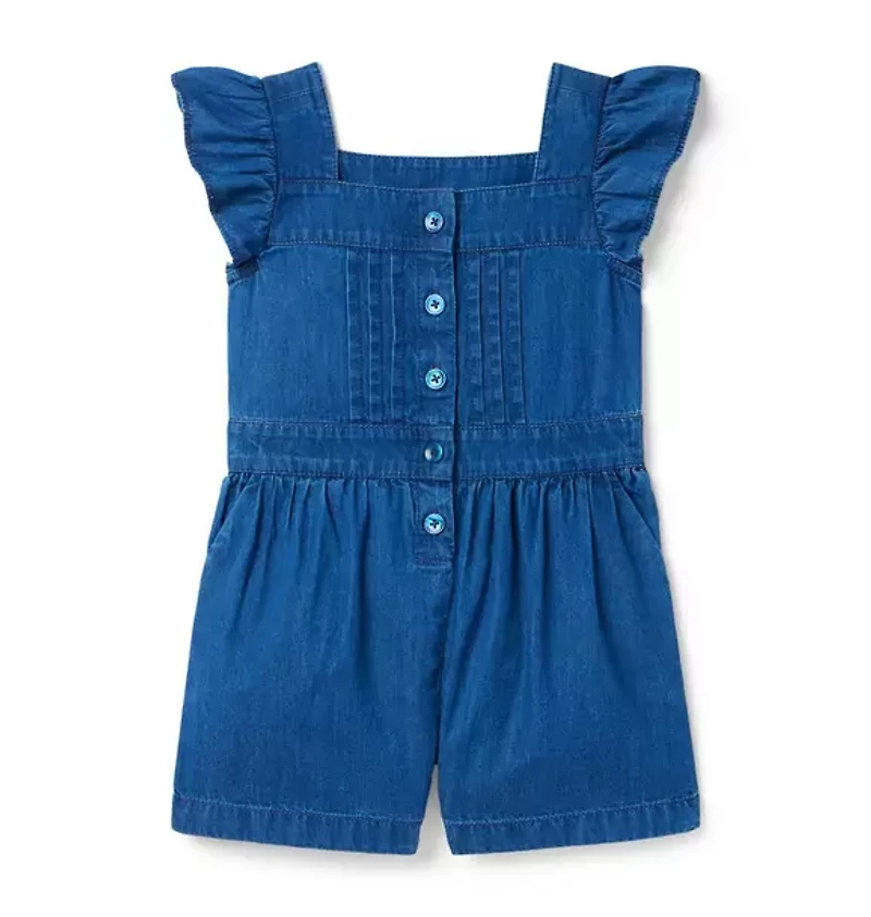 Chambray for every day. With pintuck details, flutter sleeves and pockets too, our romper is ready to wear your way. 100% Cotton Chambray Short Sleeve Button Front Front Pockets Snaps Underneath (Sizes Up To 18-24M) Machine Washable; Imported