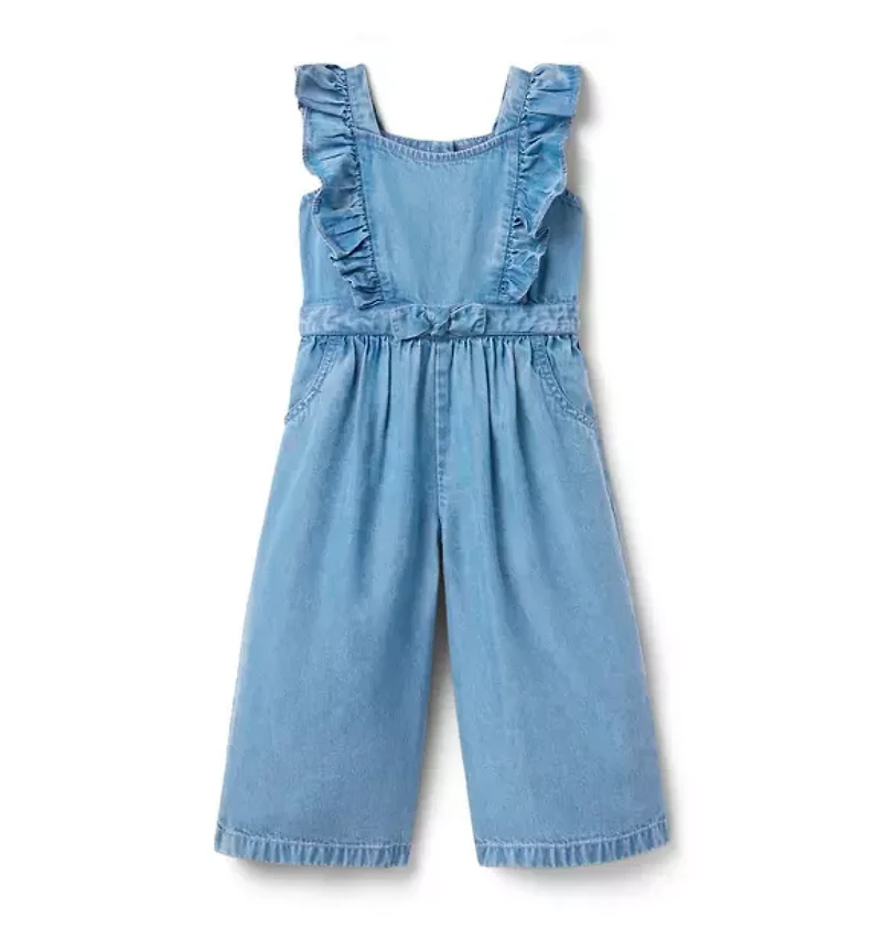 Ruffles and chambray make our jumpsuit perfect for sunny days. Designed in a wide leg silhouette with a bow at the waist. 100% Lyocell Chambray Sleeveless Button Back; Snaps Underneath (Sizes Up To 18-24M) Front Pockets Online Exclusive Machine Washable; Imported