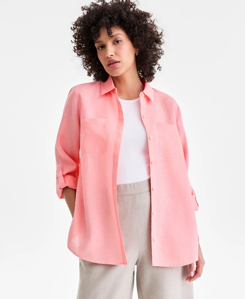 Charter Club's comfortable linen shirt works wonders in your wardrobe with classic button front closures and versatile roll-tab sleeves.