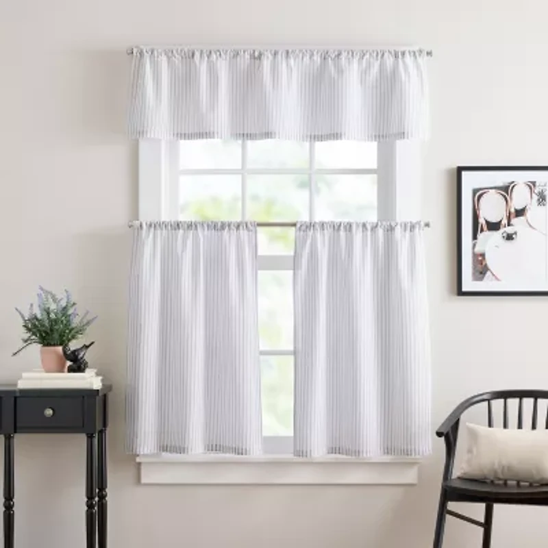 Minimal, fresh, and effortless, the Curtain works James Valance and Tier Set brings everyday charm to your small windows. Featuring a classic slim stripe in white and grey, this 3-piece set feels timeless and blends easily with your existing home decor. The light filtering style keeps your space bright while adding just the right amount of coverage for kitchens, bathrooms, laundry rooms, or anywhere that could use a little style lift.