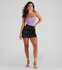 Chic and flirty, this sleek satin mini skirt will step up your date night look! It features a high-rise waist, a side knot detail, a faux wrap-front design, and a short, A-line silhouette. Style with a corset top and mules. Fit & Features High-rise waist, back elastic band Side knot detail Faux wrap-front Mini-length hem, A-line silhouette Smooth satin fabric, no stretch Runs true to size