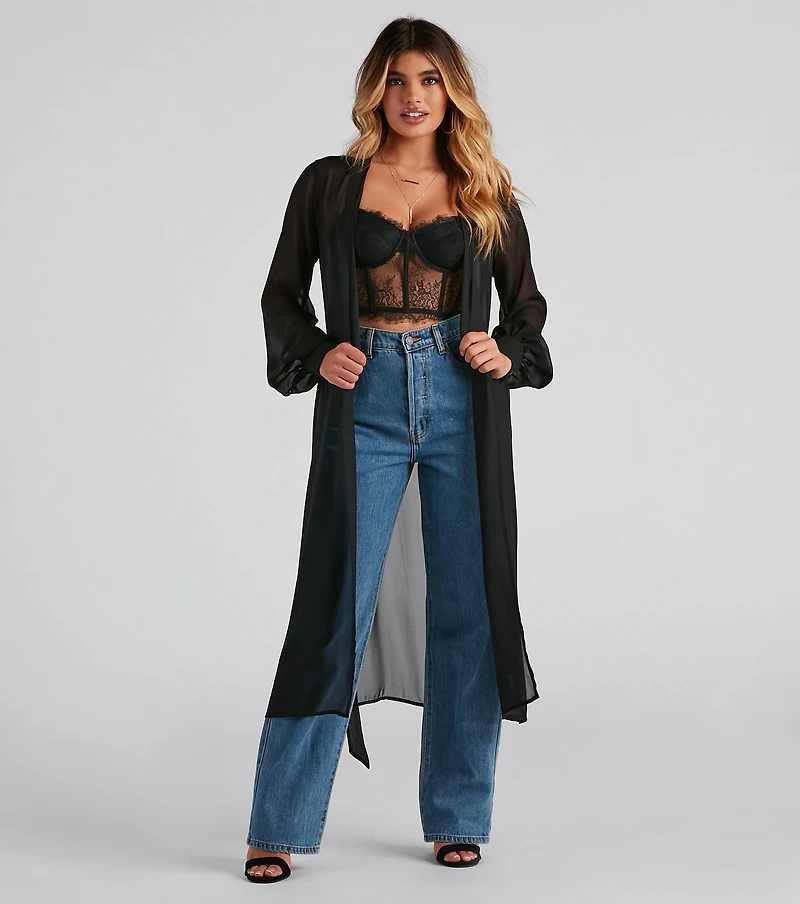 Showcase chic perfection in this airy chiffon trench. Featuring long blouson sleeves, a tie-front belt, and a flowy mid-length silhouette, this trench is the perfect lightweight layer. Style with strappy mules.
