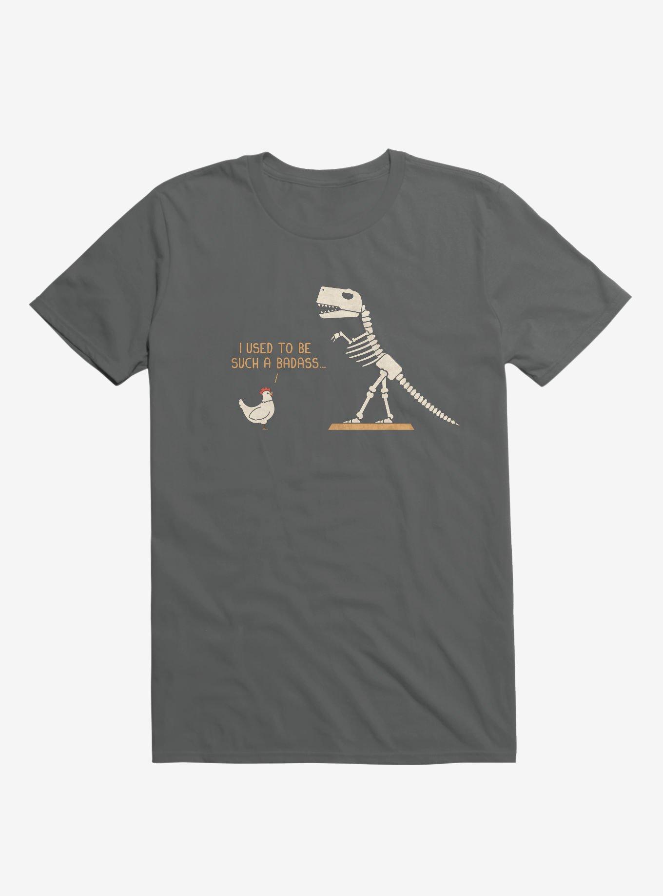 Did you know birds are part of the dinosaur family tree? This lightweight charcoal grey tee shows a chicken reflecting on its badass T-Rex past. Officially licensed art from handsoffmydinosaur.