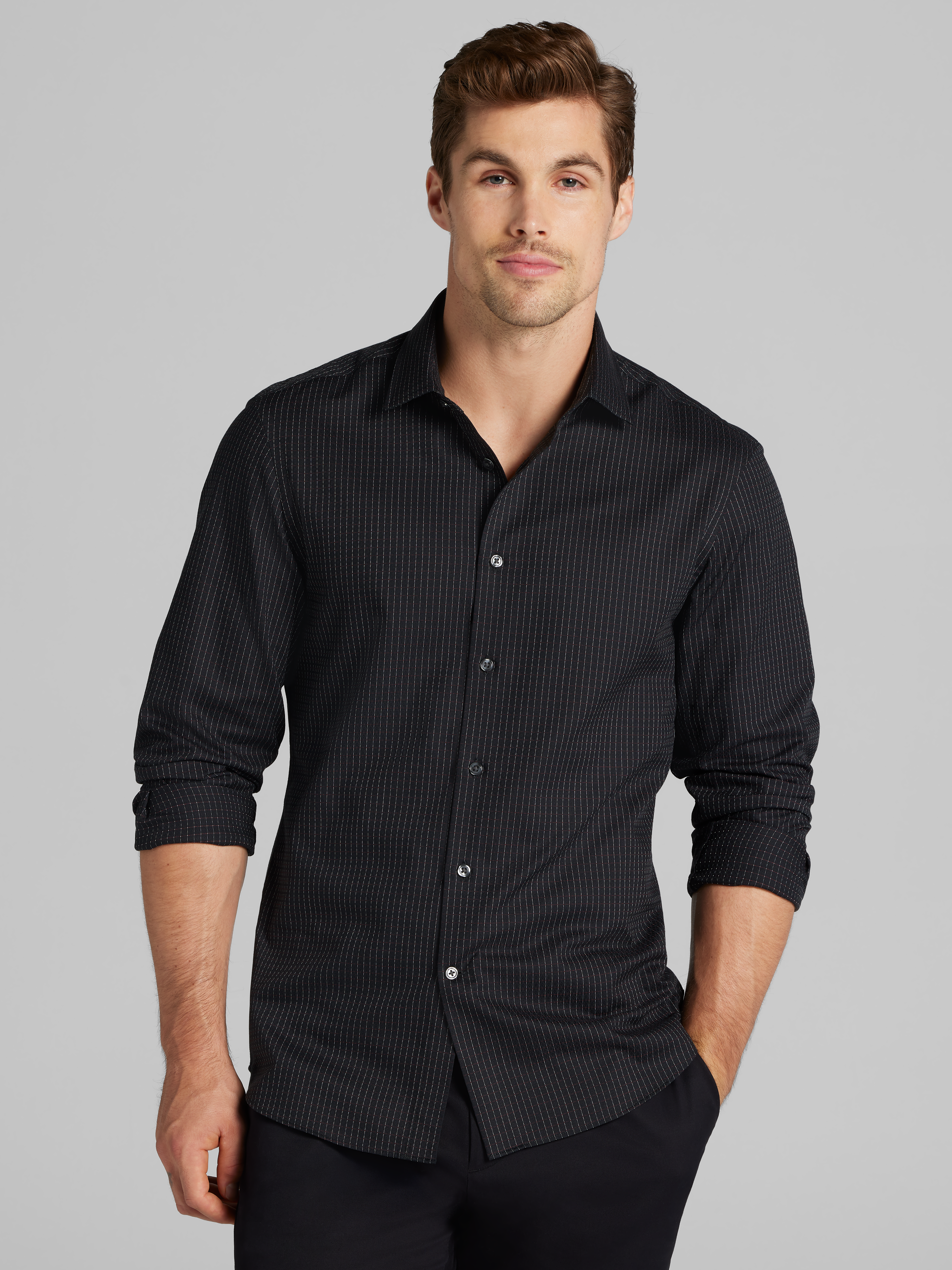 This button up shirt offers a sharp and contemporary look with its thin stripe pattern. The subtle lines provide a polished aesthetic suitable for various occasions, from the office to smart-casual gatherings. Its versatile design makes it an excellent addition to a modern wardrobe, easily paired with tailored trousers or denim.