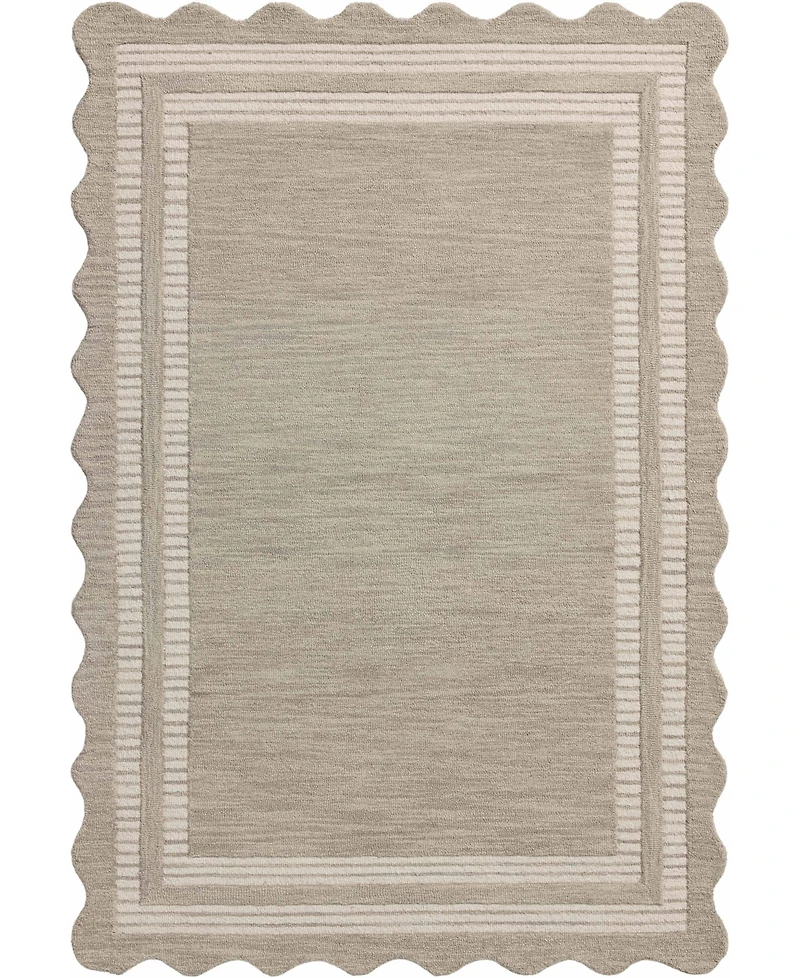 The Scottie Collection from Chris Loves Julia is a hand-tufted wool area rug with a playful scalloped edge and lower-pile, striped border for a touch of structure. The rug's overall pile is thick and plush, available in easygoing earth tones and neutral colorways. Hand-tufted of wool in India.
