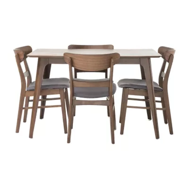 With matching wood finishes, you cannot go wrong with this dining set. Including one table and four chairs, this set is ideal for any home. The mid-century style and smooth wood finishes of this set will complement any decor, making this a perfect addition for your interior space. The dining chairs feature a sturdy design with lovely, upholstered seats that provide both comfort and style for your dining pleasure. Whether you are hosting a casual dinner with friends or dining with your family, this set will make every meal a memorable one.