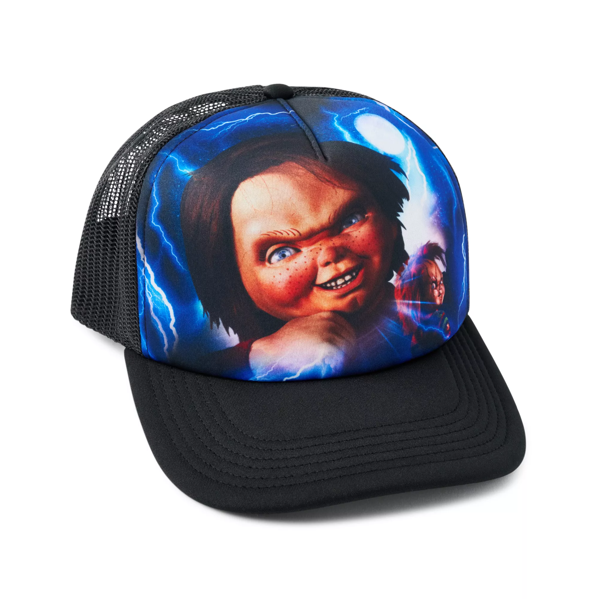 Show off your horror movie fandom with this Chucky lightning trucker hat! This bold hat is sure to get you noticed wherever you go.
