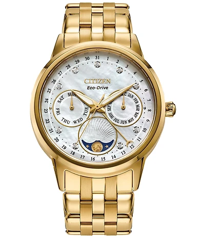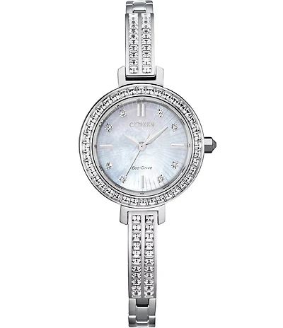 From Citizen, the Women's Silhouette Crystal Automatic Gold Stainless Steel Bracelet Watch features: Gold tone stainless steel case and bracelet Mineral crystal mother of pearl dial Fold over clasp with push buttons 88 crystal accented on the bezel and bracelet Automatic movement Approx. 34mm case size Water Resistant: 50 ATM Imported.