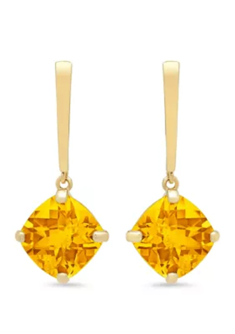 Shimmering and luxurious, these Citrine drop earrings are stamped with "14k" as a symbol of authenticity and a promise of exceptional quality. 2 Citrine stones Post back earring Prong setting Polished finish Heat treated to enhance color Imported Belk Exclusive Product Specifications 3.80 ct. t.w. Citrine 14K Yellow Gold, 8 mm x 8 mm x 8 mm Material & Care Metal Requires specialty care