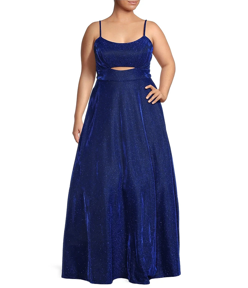 From City Vibe Plus, this ball gown features: Glitter Scoop neckline Sleeveless Front cut-out Lace back Zip back closure Polyester Dry clean Imported.
