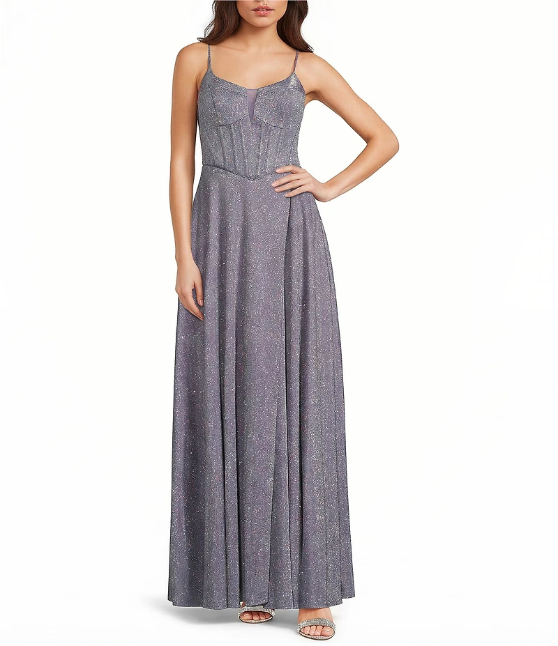 From City Vibe, this dress features: Sweetheart neckline Spaghetti straps Corset bodice with center inset Zip and lace up back closure Approx. 62.25" length Metallic/polyester; lined Dry clean Imported.