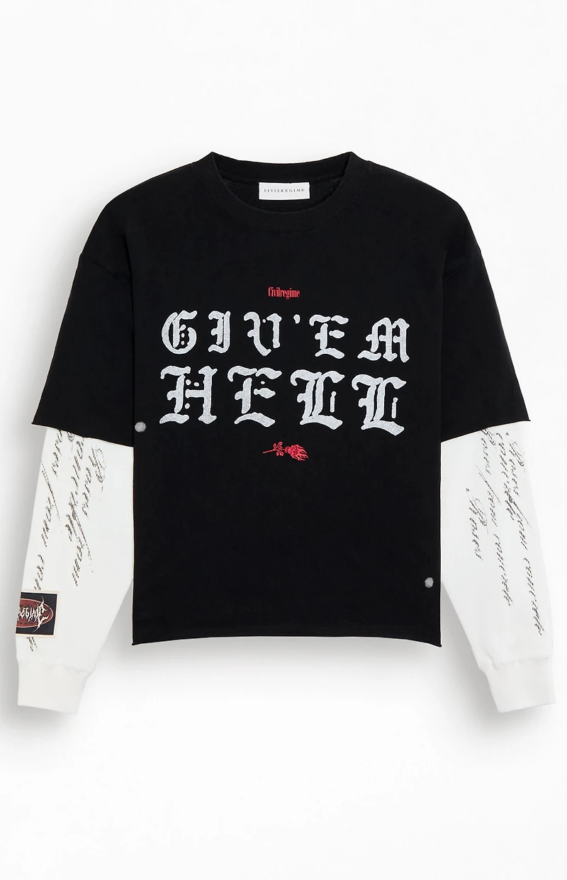 The Give 'Em Hell Layered T‑Shirt from Civil brings bold, street-ready style to your layered look. Featuring a layered design, long sleeves, a crew neckline, Civil graphics on the front and sleeves, and a woven patch at the sleeve hem for a standout, urban-inspired finish.
