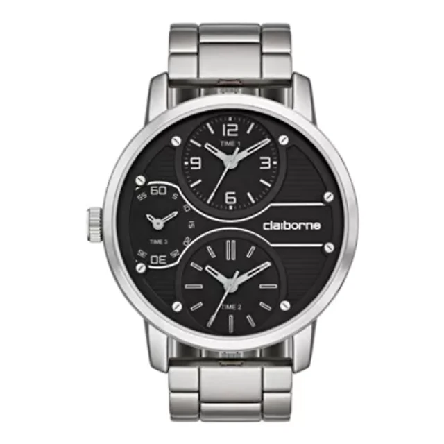 Special Features: Black multifunction dial, three time zones, luminous hands and markers, durable ionic plating, trendy oversized case, silver-tone metal alloy bracelet, 3ATM water resistance