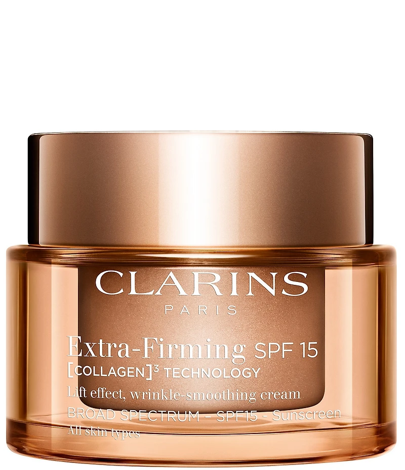 What It Is: A firming day cream with Collagen Polypeptide, Niacinamide & SPF 15 to visibly smooth wrinkles, plump and define contours, while brightening and evening skin tone. Skin is visibly firmer in 7 days. What It Does: This high-performance, comforting day cream with SPF 15 targets signs of collagen breakdown to contour and lift sagging skin, smooth wrinkles, and revitalize a dull, uneven complexion. Skin appears visibly lifted, brighter and more even. Protects against daily pollution and UV damage. The sensorial, comforting texture melts into skin with a non-greasy feel. Suitable for all skin types. Features and Benefits: Targets sagging by visibly firming and lifting Plumps and smoothes wrinkles Defines facial contours Evens and brightens skin tone Visibly reduces pores Protects from UVA/UVB rays with SPF15 Clarins' plant-based Anti-Pollution Complex helps protect skin from indoor and outdoor pollution, including blue light from electronics Key Ingredients: Biotech Collagen Polypeptide: Helps visibly firm, plump, smooth skin Niacinamide: Evens skin tone and brightens Oat Sugars: Instantly lift and tighten skin Clarins' Plant-Based Anti-Pollution Complex — featuring Nipplewort, Furcellaria, and Organic White Horehound extracts — helps protect skin from indoor and outdoor pollutants, including blue light from electronics How to Use: Smooth over clean face and neck each morning Apply with gentle press-and-release movements, avoiding the eye contour area Work downward, over neck and décolleté