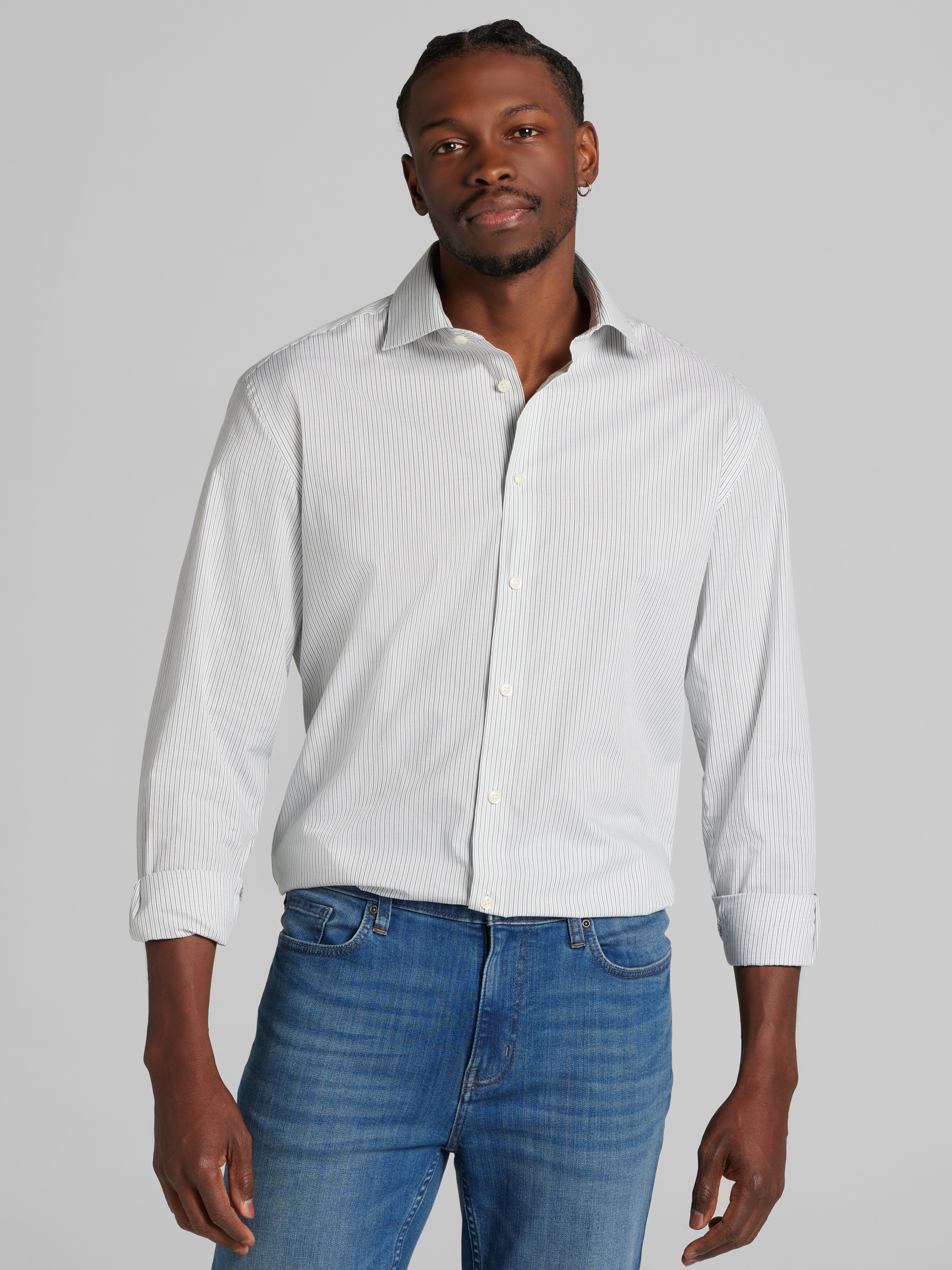 Every great outfit starts with a classic, and this fine line stripe dress shirt is no exception. Designed for effortless style, it features a spread collar and a polished button-front closure that says, "Yes, I mean business", while its lightweight cotton blend ensures all-day comfort. The classic fit provides just the right amount of room for a sharp yet relaxed look. Ideal for workdays, date nights, or whenever you need to up your wardrobe game. Pair it with trousers, jeans, or whatever makes you feel on top of your style game. Effortless sophistication? Youve got it.