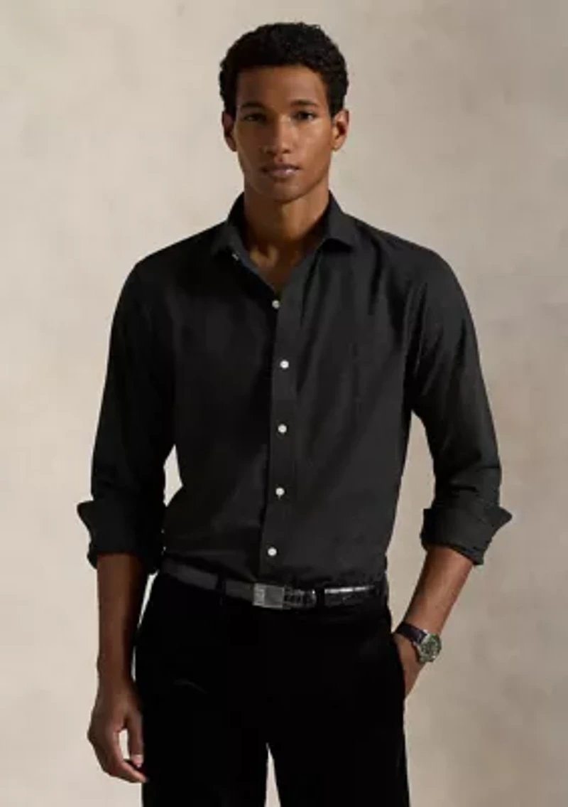 Classic Fit: Cut fuller through the chest, waist, and sleeve, with a lower armhole. Size medium has a 32.5” back body length, an 18.5” shoulder, a 46.5” chest, and a 35” sleeve length. Sleeve length is taken from the center back of the neck. Medium-spread collar. Buttoned placket. Long sleeves with buttoned barrel cuffs. Split pleated back yoke ensures smooth, contoured shoulders. Signature embroidered Pony at the left chest. Model is 6'1" (185 cm) and wears a size medium. Imported Material & Care Cotton, polyester Machine washable