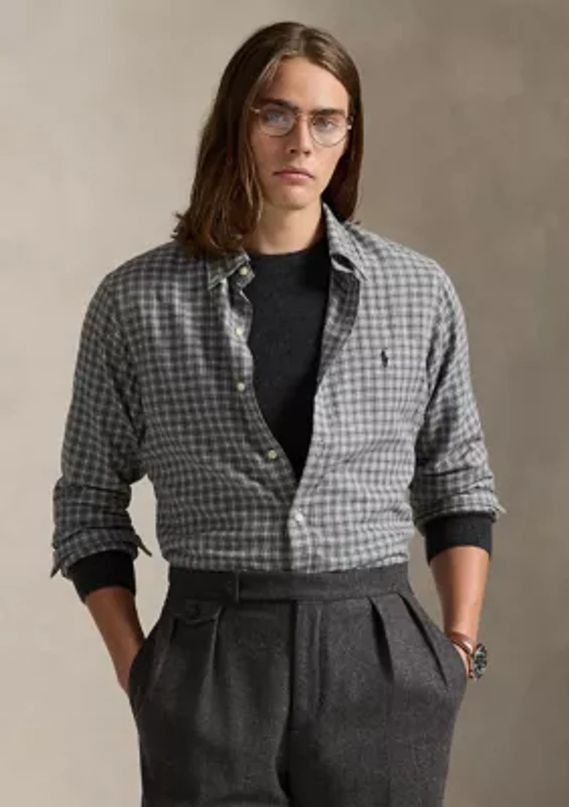 Covered in classic plaid, this twill shirt from Polo Ralph Lauren is made from cotton for long-term comfort and breathability. Classic Fit: Cut fuller through the chest, waist, and sleeve, with a lower armhole. Size medium has a 32.5" back body length, an 18.5" shoulder, a 46.5" chest, and a 35" sleeve length. Sleeve length is taken from the center back of the neck and changes 1" between sizes. Button-down point collar. Buttoned placket. Long sleeves with buttoned barrel cuffs. Split back yoke with a box pleat ensures a comfortable fit and a greater range of motion. Signature embroidered Pony at the left chest. Cotton. By choosing Ralph Lauren’s cotton products, you’re supporting investment in the Better Cotton™ mission to help cotton communities survive and thrive, while protecting and restoring the environment. This product is sourced via a system of mass balance and therefore may not contain Better Cotton™. Visit bettercotton.org/mass balance for more information about mass balance. Model is 6'1" (185 cm) and wears a size medium. Imported Material & Care Cotton Machine washable