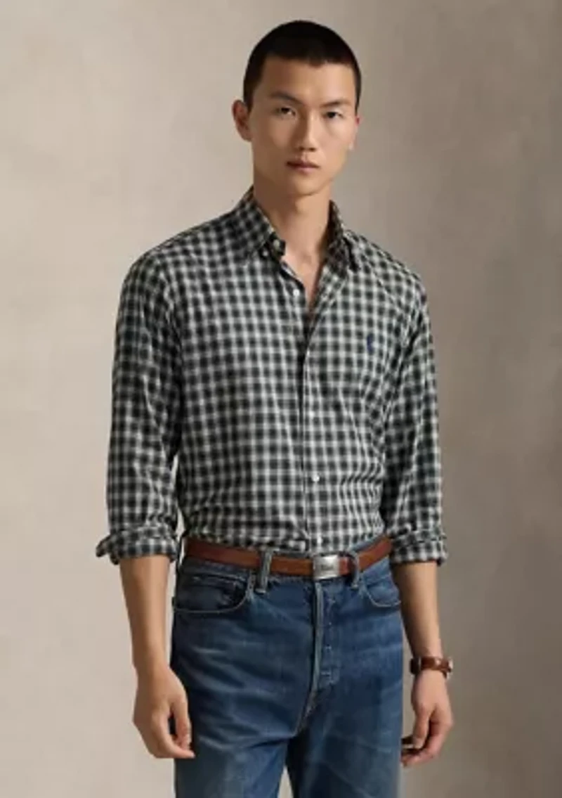 This plaid shirt is crafted from silky cotton twill and finished with Polo Ralph Lauren's signature embroidered Pony. Classic Fit: Polo Ralph Lauren's roomiest silhouette Cut for a lower armhole and a fuller sleeve Size medium has a 31.5" back body length, an 18.25" shoulder, a 46" chest, and a 34.5" sleeve length Sleeve length is taken from the center back of the neck and changes 1" between sizes Button-down point collar Buttoned placket Long sleeves with buttoned barrel cuffs Split back yoke with a box pleat ensures a comfortable fit and a greater range of motion Signature embroidered Pony at the left chest The model is 6'1" (185 cm) and wears a size medium Imported Material & Care Cotton Machine washable