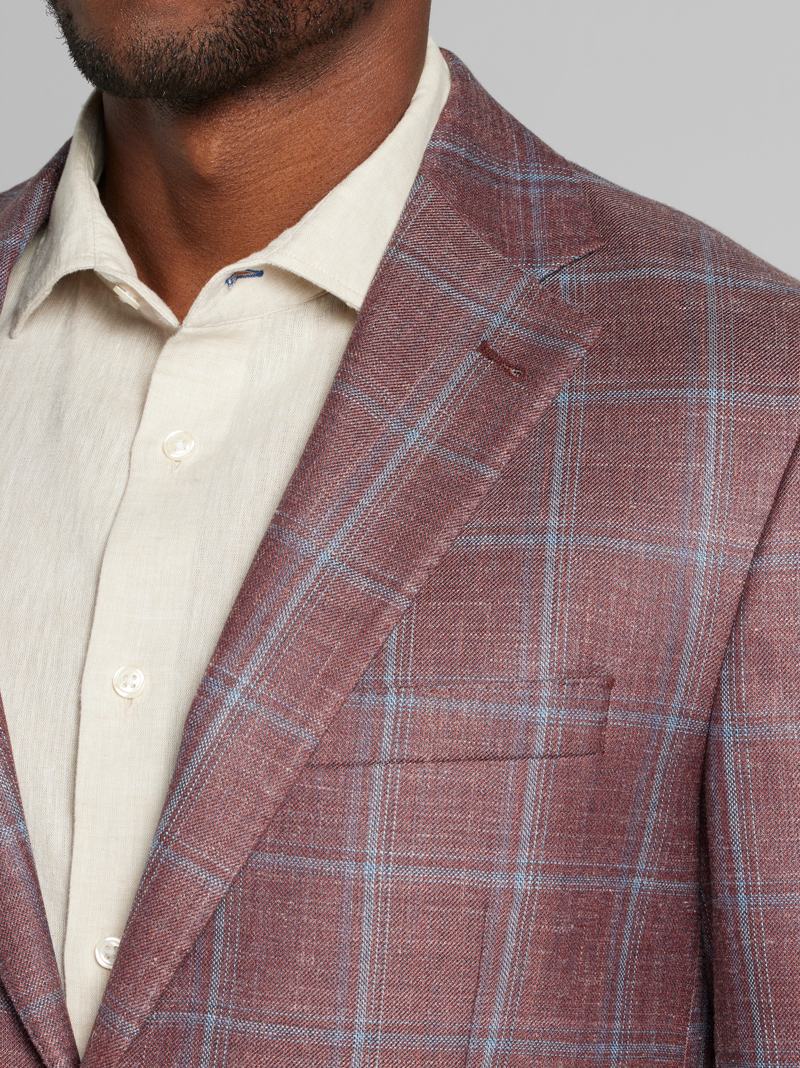 Comprised of rich wool, fine silk, and breathable linen fibers, this luxe sport coat is woven with a welcoming windowpane pattern. Classically tailored and detailed with a notch lapel, it offers versatility, enduring style, and all-day comfort.