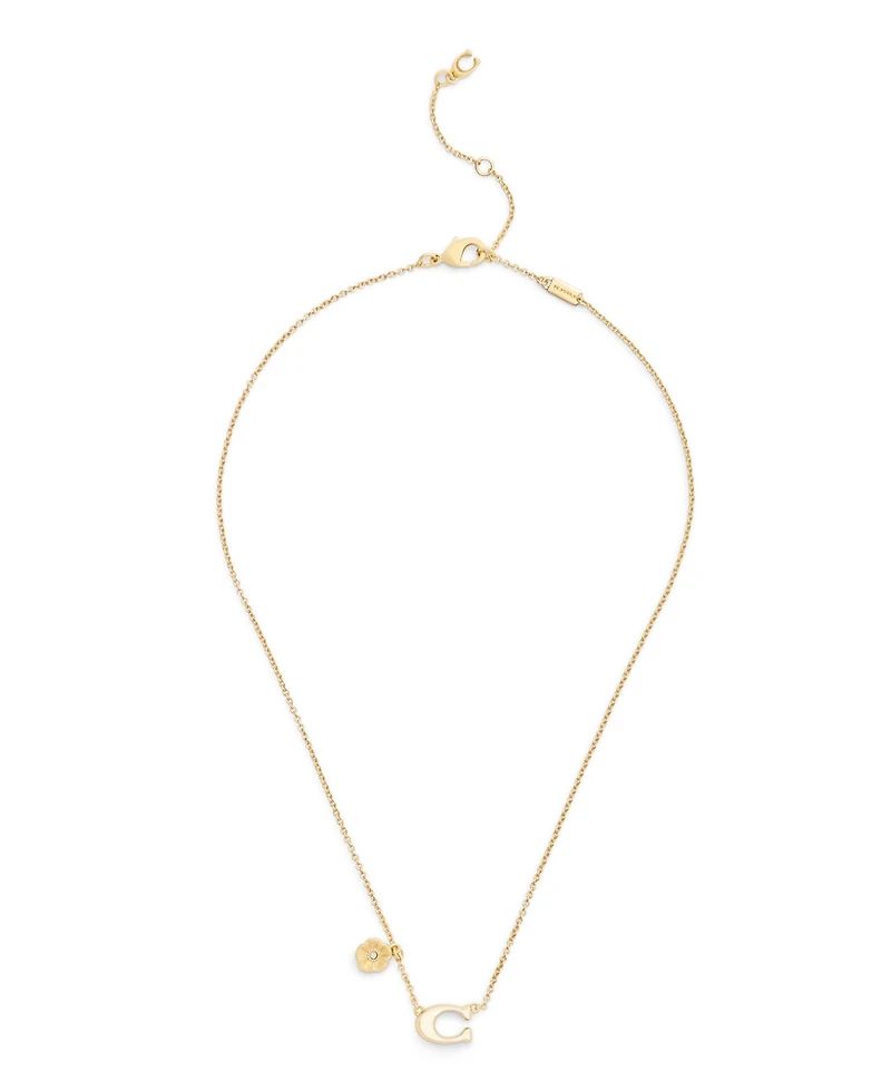 Refined chain necklace featuring signature sculpted C pendant in neutral chalk enamel paired with timeless tea rose charm.