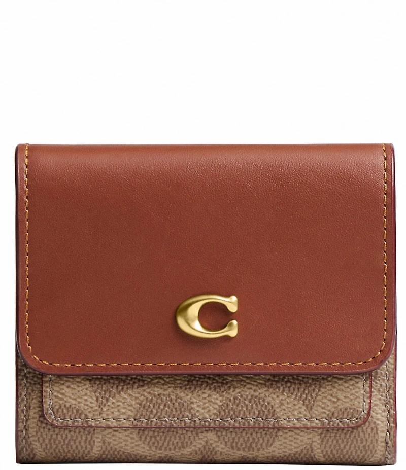 From COACH, the Mila Small Flap Wallet features: Signature coated canvas and refined calf leather Six credit card slots Full-length bill compartment Snap closure Outside zip coin pocket Approx. 4 1/4'' (L) x 3 3/4'' (H) x 1/2'' (W) Imported
