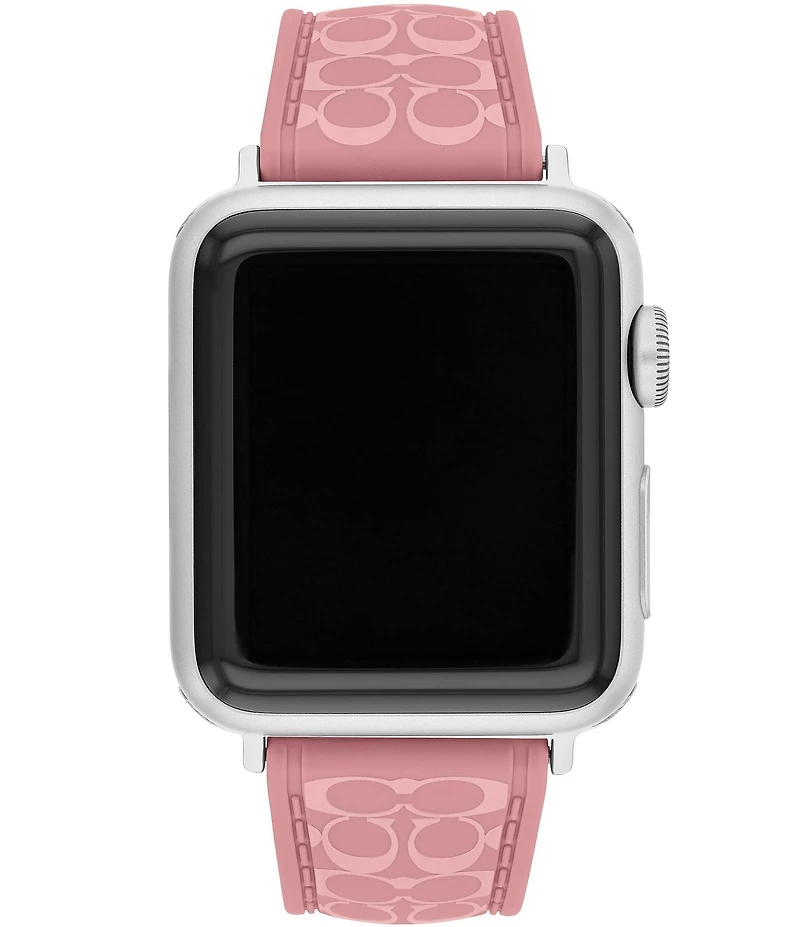 From COACH, this women's watch strap features: Silicone strap Buckle closure Made exclusively for use with the 38mm, 40mm, and 41mm Apple Watch Strap features COACH signature and secures with stainless steel hardware Water resistance Imported.