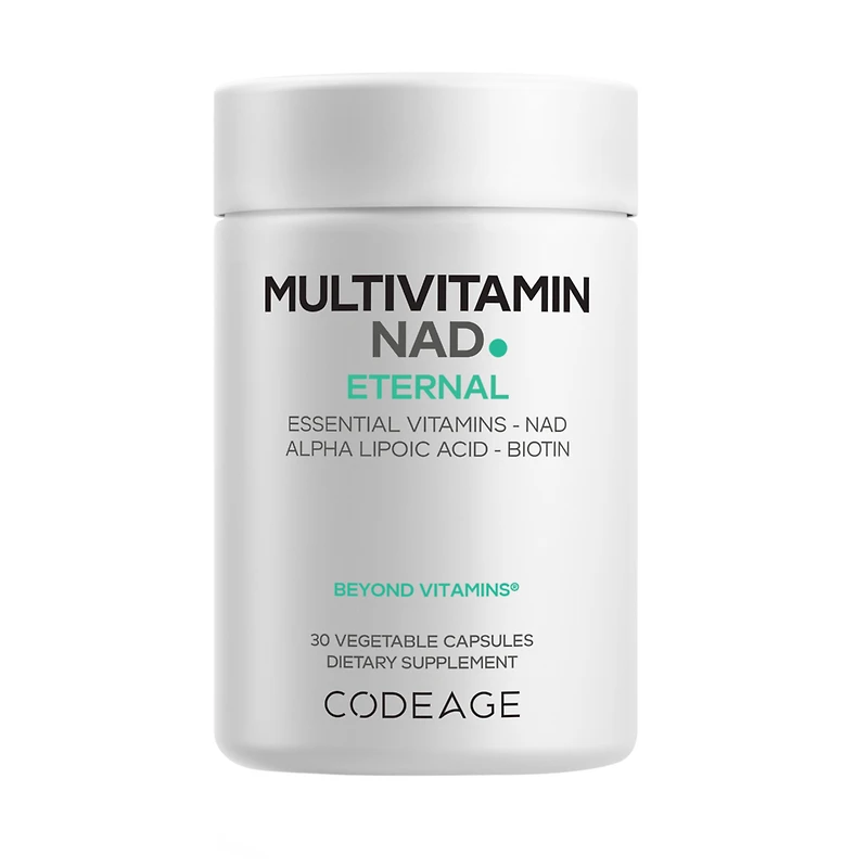 Multivitamin with NAD+, Methylated B Vit. Features: Codeage Multivitamin NAD offers an advanced Nicotinamide Adenine Dinucleotide (NAD+) formula with a comprehensive multivitamin profile, including methylated Vitamin B12 (Methylcobalamin), methylated Folate, P5P (active vitamin B6), Vitamin A (as Beta Carotene), C, D3, E, and K2 all-in-one.. This NAD capsule supplement also features Alpha Lipoic Acid. This NAD pills supplement comes with 5000 mcg of biotin per serving (Vitamin B7), known for its role in metabolism.. Codeage Multivitamin NAD offers a blend of nutrients, including thiamin, riboflavin, niacin, and pantothenic acid to create a well-rounded ingredient profile.. This NAD capsule supplement is vegan, non-GMO, gluten-free, soy-free, and dairy-free. Each bottle offers 30 servings in capsule form, providing a 1-month supply.. Codeage Multivitamin NAD is manufactured in the USA using global ingredients in a cGMP-certified facility for quality and purity.. : :