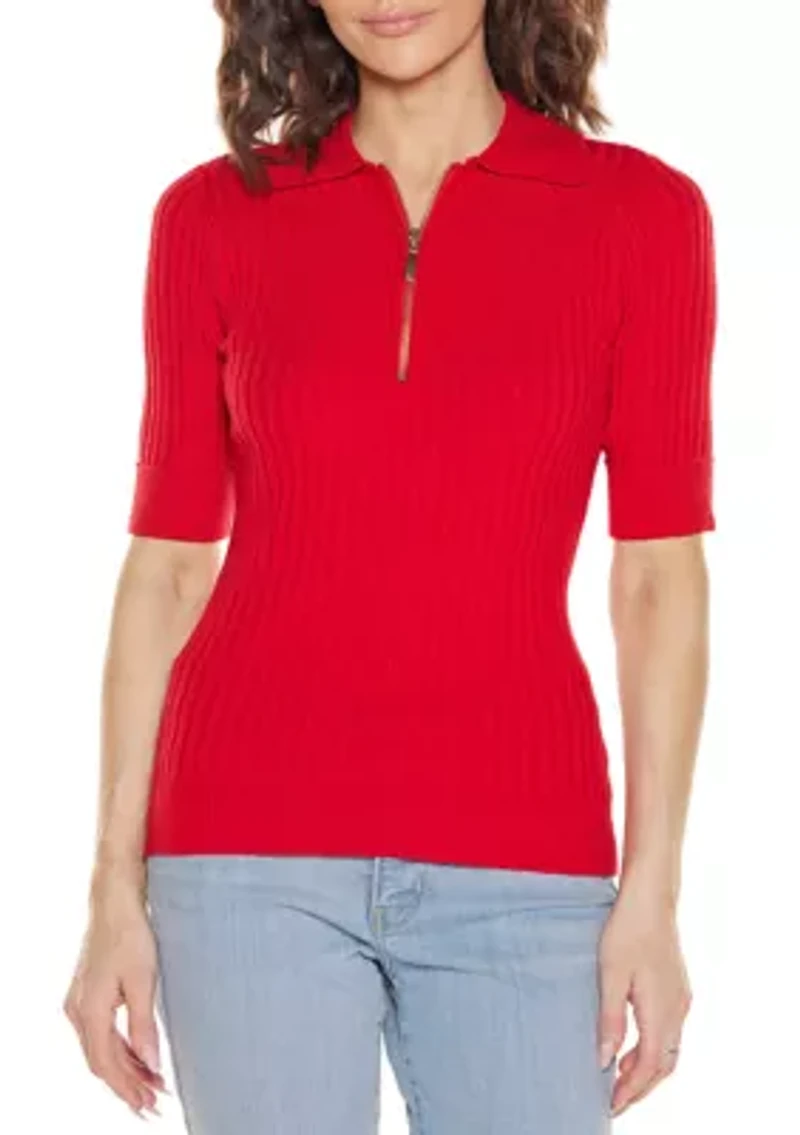 Zip into style with this collared short-sleeve ribbed-knit sweater, featuring a front quarter-zip and fold-up cuffs for a sporty-chic finish.; Approx. model height is 5'9" and she is wearing a size Small; Front quarter-zip; Hits at hips; Fitted Zip closure Collar Short sleeve Unlined Imported Product Specifications 23 1/2" long Material & Care Viscose/ViscoseBlend Hand wash