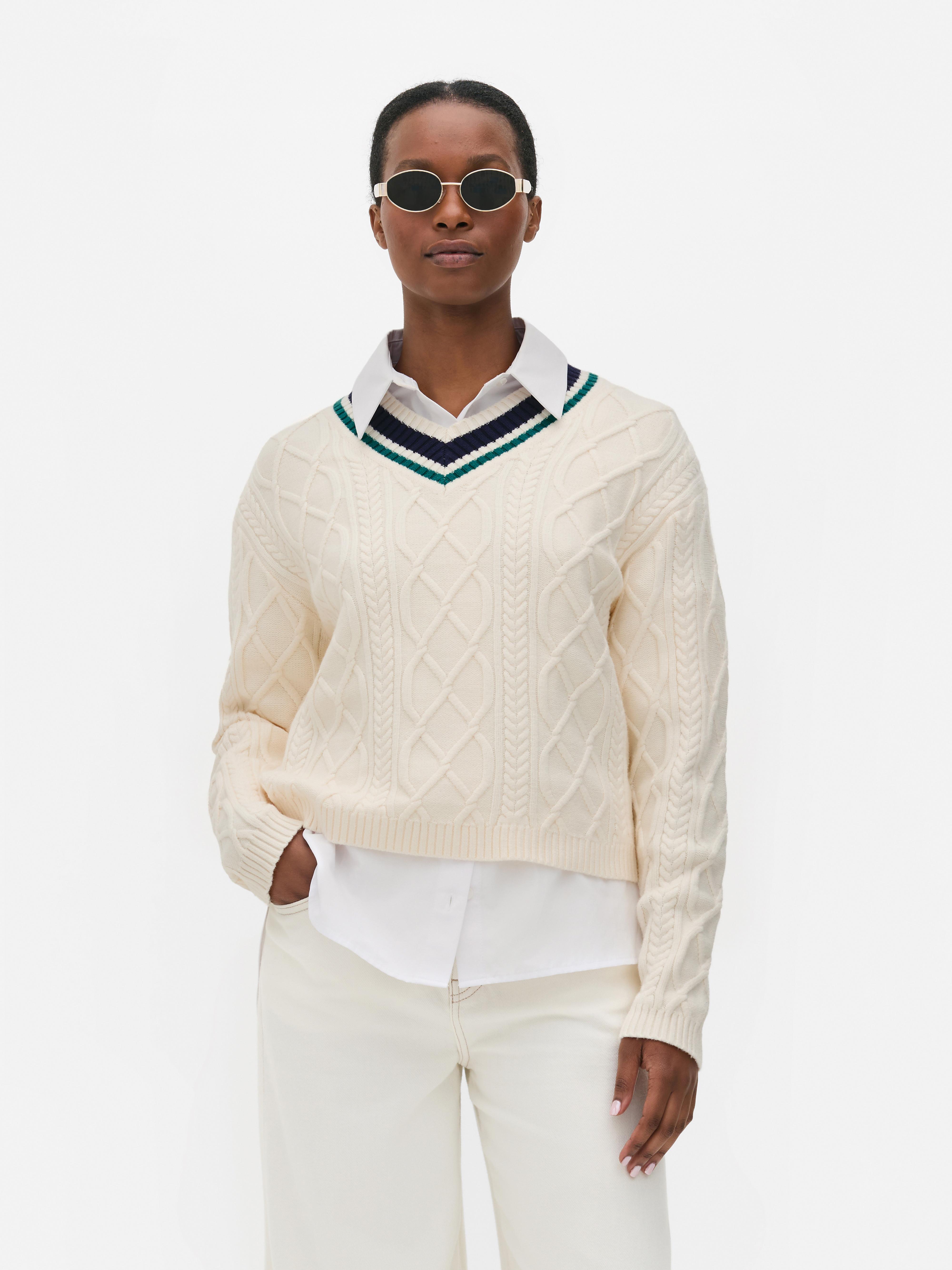 Cream cable-knit sweater with a striped V-neck cut