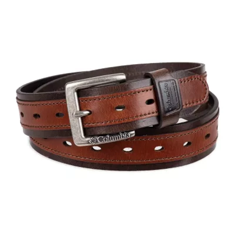 This casual Columbia men's belt is a great addition to your accessory collection - featuring a two-tone overlay belt strap and all over perforation for full adjustability to get the perfect fit every time. Belt strap width measures 1.5 inches to easily fit in your belt loops. For best fit, order a size 2" larger than your waist size. If your waist size is 34", order belt size 36". Alpha size info: Small (30"- 32"), Medium (34"- 36"), Large (38"- 40"), Extra Large (42"- 44").