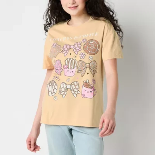 Conchas Y Cafe Boyfriend Womens Juniors Crew Neck Short Sleeve Regular Fit Graphic T-Shirt