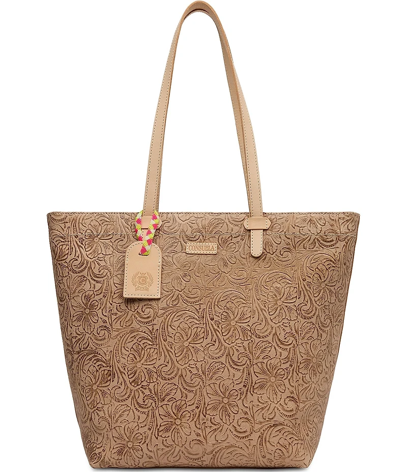 From Consuela, this tote bag features: Tan tooled leather exterior Natural leather handles and trim Zipper closure Interior slide pocket and hook-clip lanyard Handle drop approx. 12" Approx. 12" W at the base, 17" W at the top x 13" H x 7" D Imported.