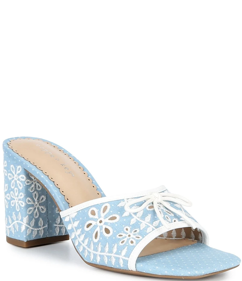 From Copper Key, the Cape Floral Embroidered Polka Dot Dress Slide Sandals feature: Fabric upper with polka dot print and floral embroidery Mini bow detailing Slip on design Synthetic lining Rubber outsole Approx. 3.15" heel height Imported.