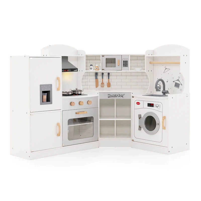Corner Play Kitchen Toddler Kitchen Playset with Range Hood, Ice Maker, Microwave