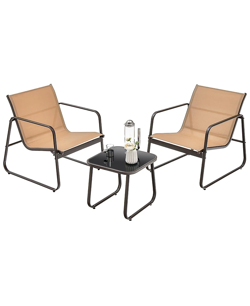 Costway 3 Pieces Patio Conversation Set Outdoor Metal Chair & Table Tempered Glass Top