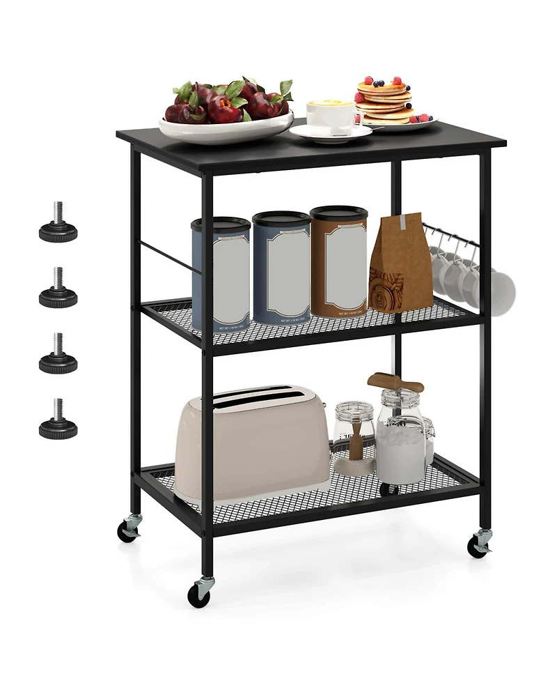 Costway 3-Tier Kitchen Serving Cart Utility Standing Microwave Rack with Hooks Rustic