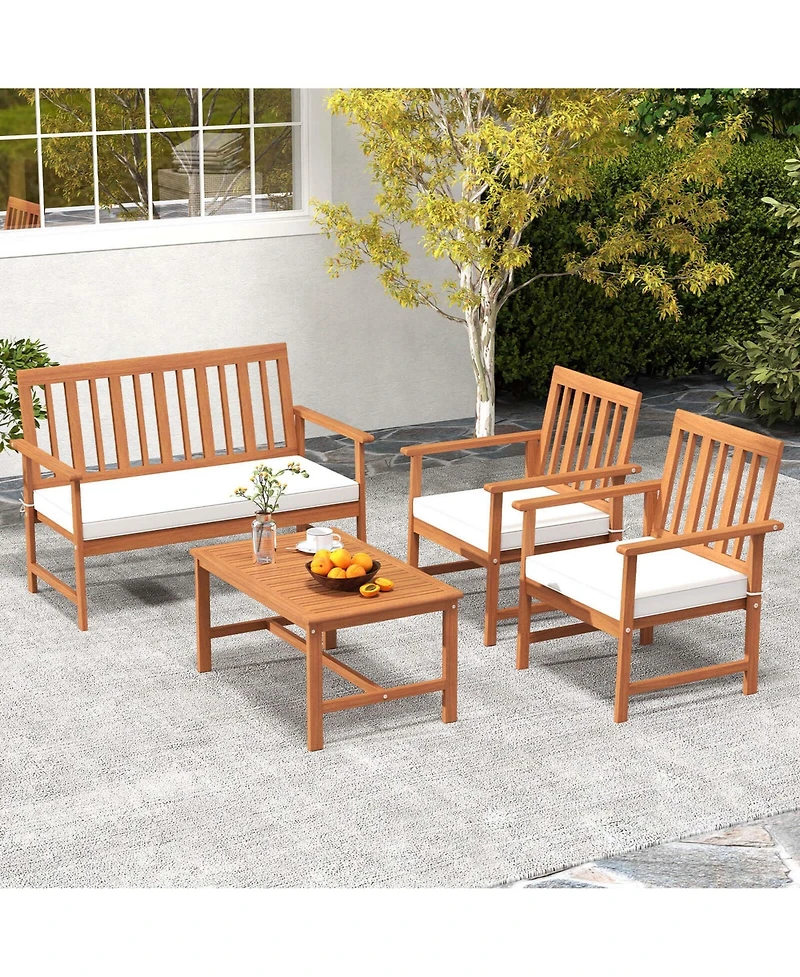 Costway Acacia Wood Furniture Set Coffee Table & 2 Armchairs with Seat Cushions