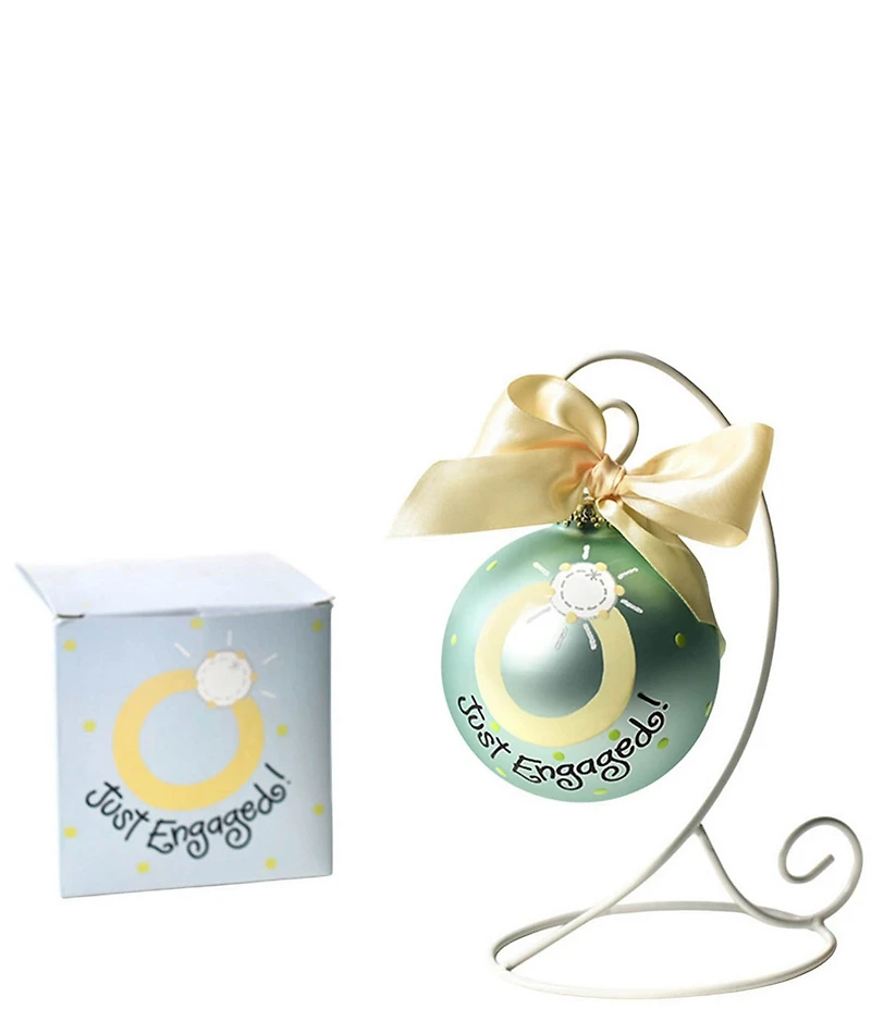 From Coton Colors , this features: Ornament with White Stand Celebrate upcoming nuptials with this beautiful Just Engaged Ornament with White Stand. Set of 2 ornament with white ornament stand Crafted of glass , metal, ribbon Features hand painted engaged ring with dots Coordinating matching gift box and ribbon Year around shelf accessory or room decor. Approx.100mm Imported.