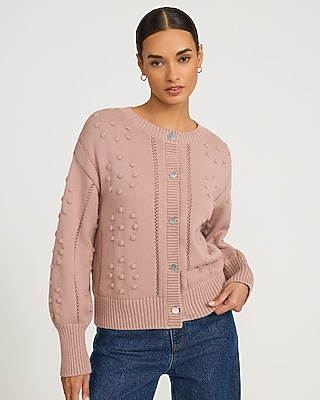 Complete with a playful textured pom pom design, this crew neck cardigan is the perfect sweater for solo wear or for styling over your favorite tees and tanks. It features a button front and long puff sleeves.