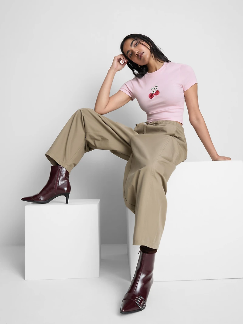 In a soft cotton, this baby tee has a crew neckline, short sleeves, and an embroidered graphic
