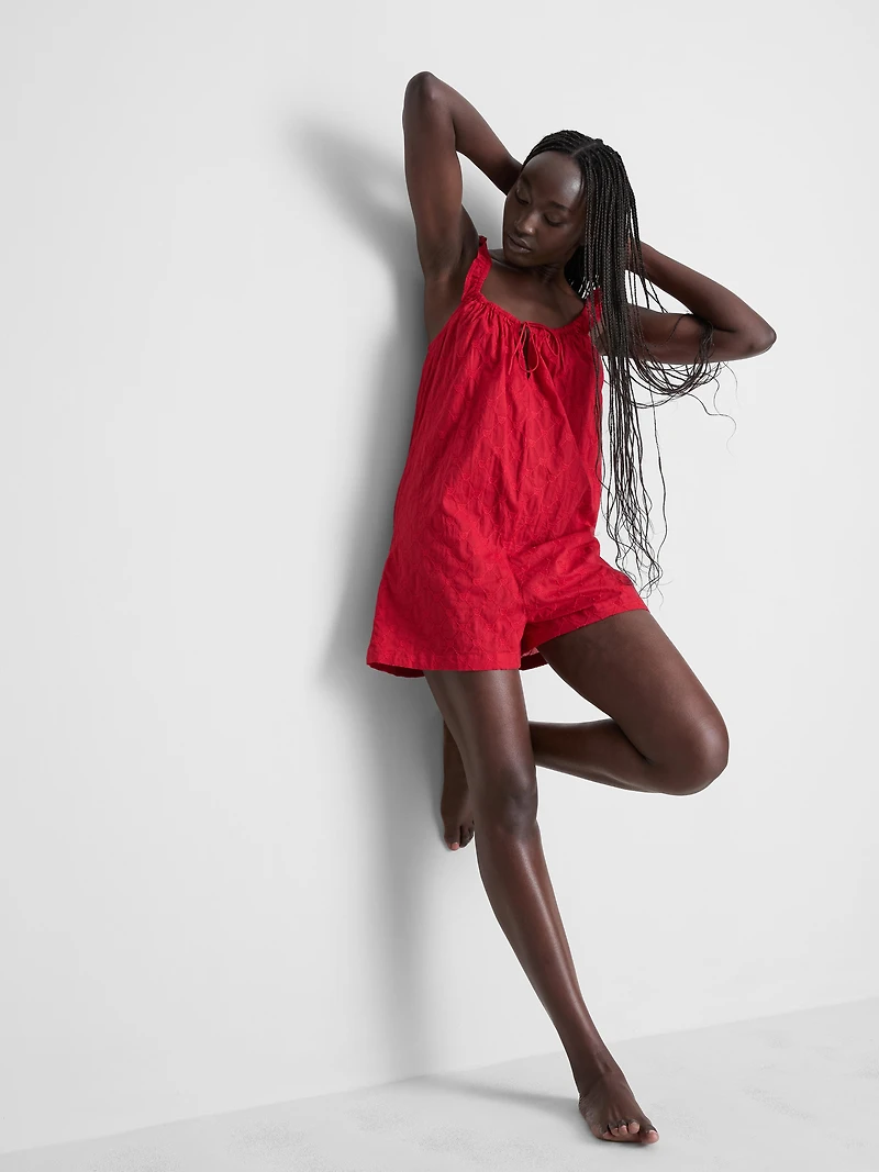 Red cotton romper with heart embroidery, frill straps, and tie-front detail