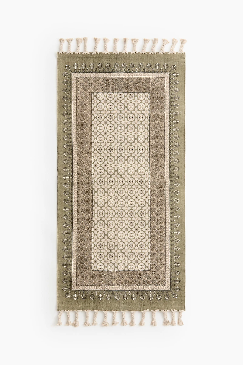 Runner rug in woven cotton with a classic pattern. Fringe at short sides.