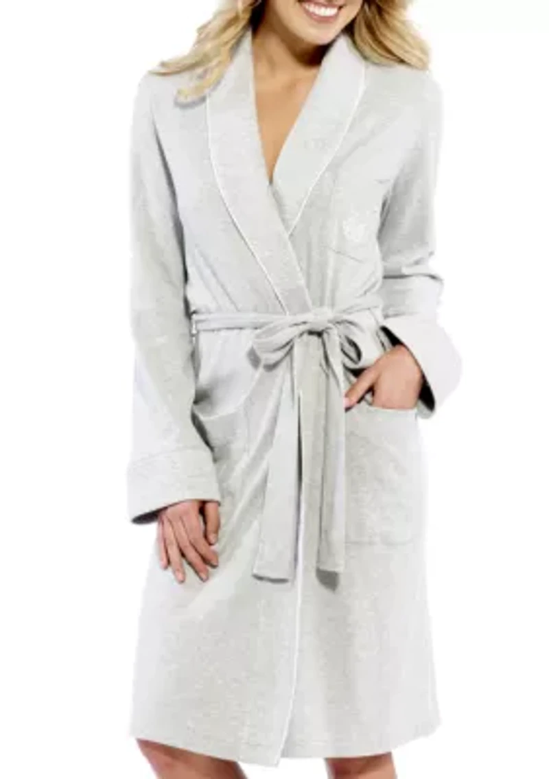 This brushed cotton wrap robe is trimmed with a double knit quilt on the shawl collar and cuff. Piping details and a signature monogram embroidery on the top left pocket make this comfortable style an instant classic. Tie waist Quilted shawl collar Long set-in sleeve 2 patch pockets and Lauren monogram embroidery on the top left pocket Imported Product Specifications 40 in Length Material & Care Cotton Machine washable