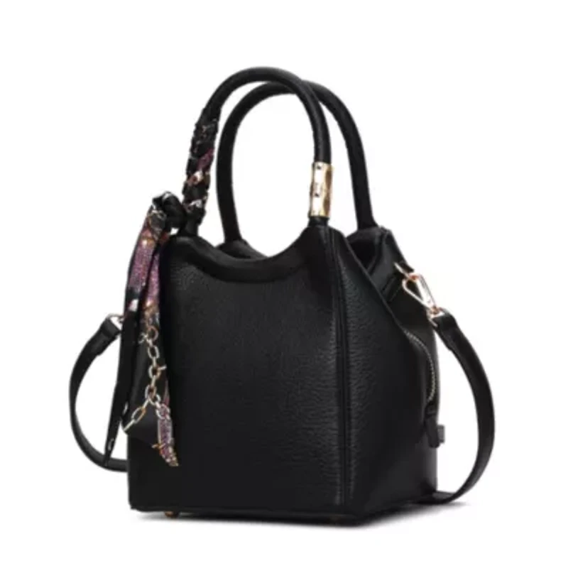 Introducing the Courtney Handbag- a true standout in both uniqueness and chic style. Crafted from beautiful faux pebbled leather with modern gold hardware, it offers versatility as a crossbody or handbag. Its defining feature? A silk scarf delicately tied around the handle, adding a touch of personality and visual interest. Double top handles Gold-tone hardware A wall zipper pocket and a slip pocket, 1, Yes China Imported Product Specifications Measurements: 7.25 W X 7H X 5.25 D Material & Care Faux Leather Clean with a soft cloth.