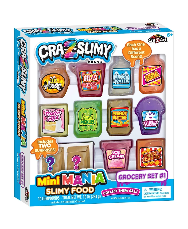 Cra-z-slimy Mini Mania: Slimy Food - Grocery Set #1 - Cra-z-Slimy want you to enjoy these Scented Mini Mania Slimy Foods with two surprises! Adorable mini sized products filled with super gooey slimy! 10 different multicolor Slimy Foods Honey, Gel-lo, Spring Water, Soda, Cheese Crackers, Sweet Pickles, Peanut Butter, Slushy, Ice Cream, Cake Mix, plus two surprise scents. Some scents, such as Peanut Butter or Slushie, are particularly strong, while others are more subtle. Each scented slimy comes in a tiny plastic container shaped like the container of the food that inspired it. For example, the spring water slime comes in a water bottle-shaped package and the sweet pickles slime comes in a jar-shaped package. These containers keep the slimy gooey and stretchy so that it doesn't dry out. Kids can also cut along the back of the box on the dotted lines to create a fridge door that ""opens"" and makes for a creative storage option