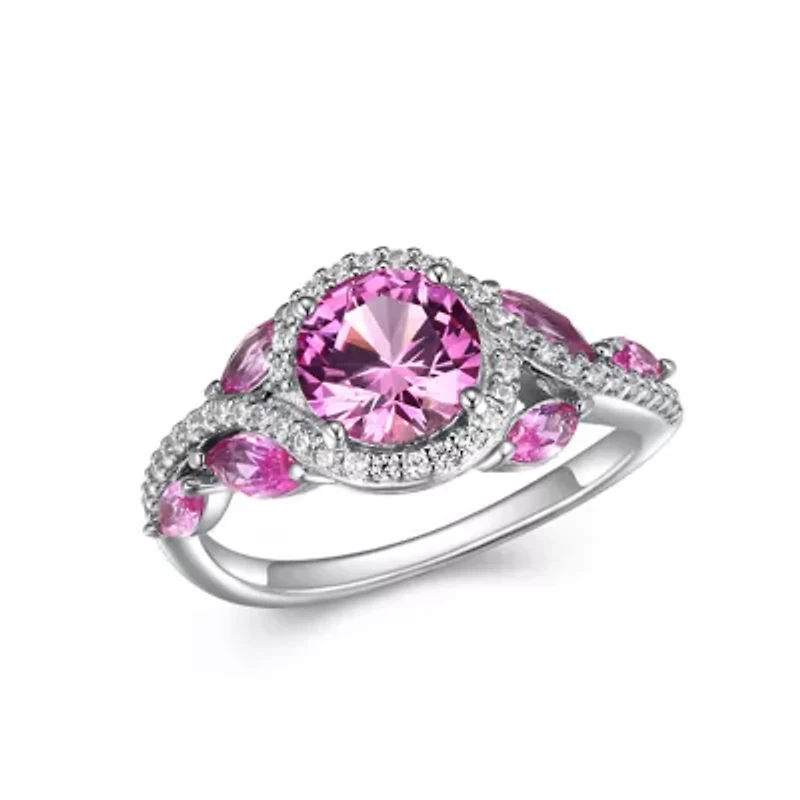 Created Pink Sapphire And CZ Ring Platinum Plated Sterling Silver