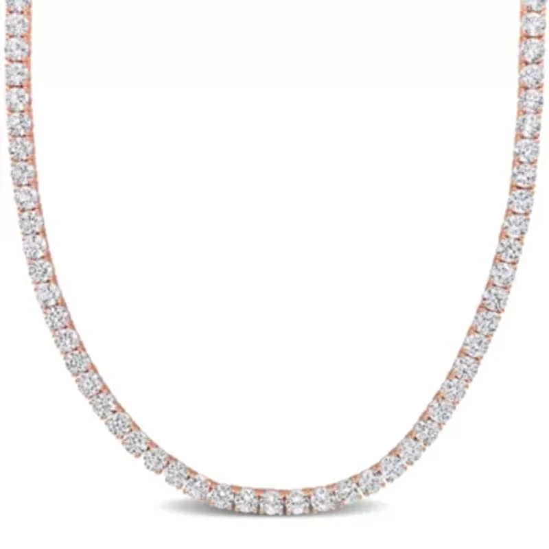This necklace is crafted in sterling silver and features a continuous row of sparkling white sapphires that create a luminous and elegant design. Available in silver, yellow silver, or rose silver finishes, each option enhances the brilliance and sophistication of the stones. The tongue and groove clasp ensures secure and comfortable wear while complementing the polished setting. Designed with careful craftsmanship, this necklace offers timeless elegance and versatility, making it a meaningful and refined addition to any jewelry collection suitable for both everyday wear and special occasions. Box clasp, 103 created white sapphire Polished finish Prong setting Warranty available, 60 days Thailand Imported Belk Exclusive Product Specifications 17" 33 ct. t.g.w. created white sapphire Material & Care Rose Plated Sterling Silver Metal, Sterling silver Clean with a soft cloth.