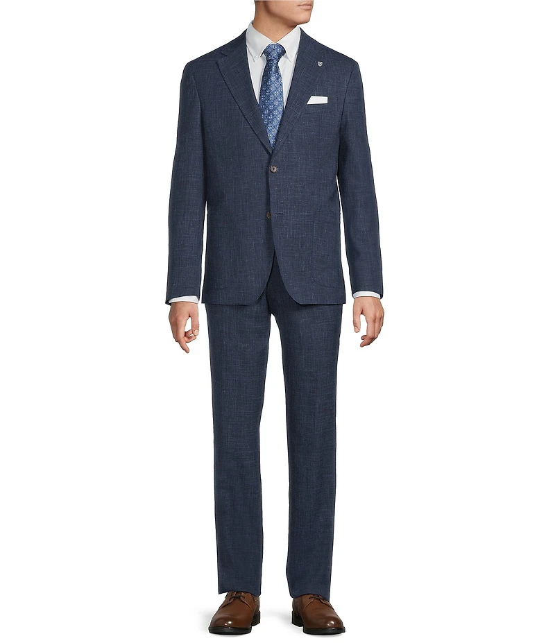 From Cremieux, this suit features: Jacket: Modern fit Notch lapel Long sleeves Single breasted Side vents Patch pockets Fully lined 2-button front closure Pants: Plain front Unfinished hem Right side watch pocket Double besom back pockets buttoned through Hook-and-eye/zip fly closure Care: Wool/silk/linen Dry clean Imported.