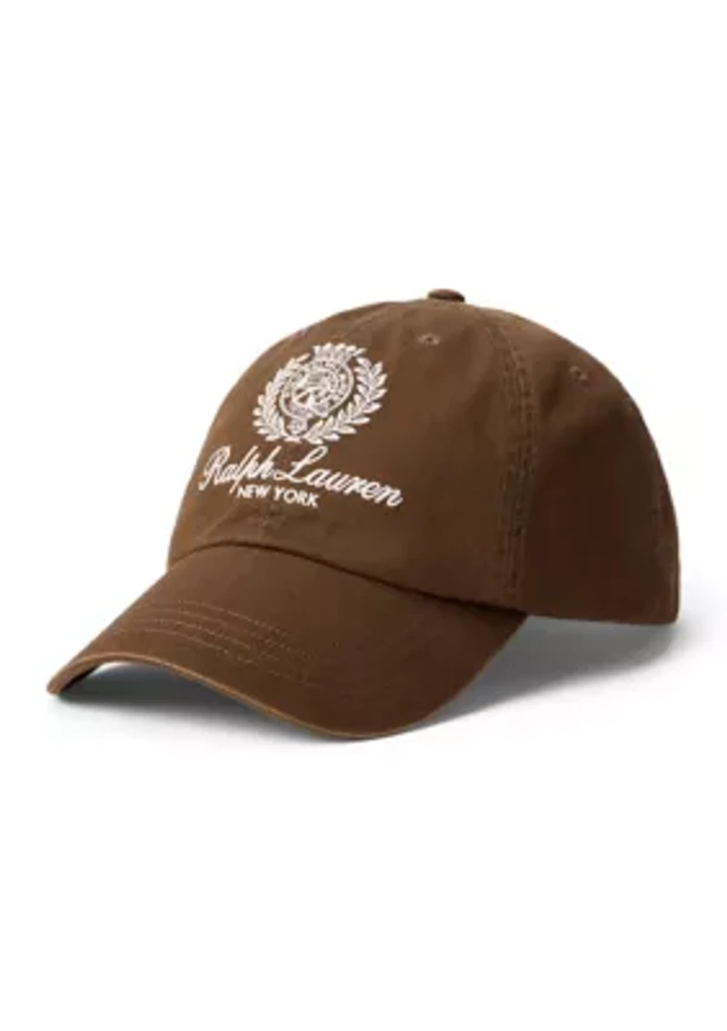 This cotton twill ball cap is embroidered with a graphic that is based on an archival crest from 1986. Ralph Lauren’s signature Pony accents the back. Seamed bill. Six-panel construction. Ventilating embroidered eyelets. Cotton twill sweatband. Circular “Polo Ralph Lauren” crest, “Ralph Lauren” script, and “New York” embroidered at the front. Adjustable buckled strap at the back. Signature embroidered Pony at the back left. 23.25" inner circumference. Shell: 100% cotton. Strap: 100% leather. Hand wash or dry clean. Imported.