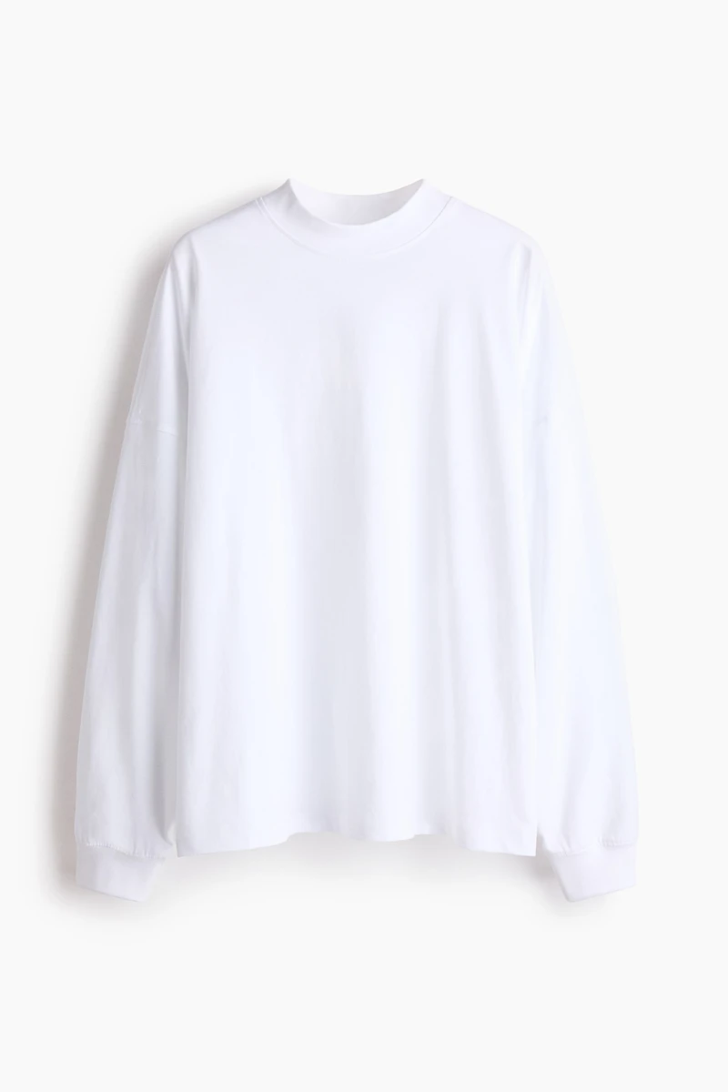 Shirt in soft jersey with slightly forward-facing shoulder seams. Crew neck, heavily dropped shoulders, and long sleeves. Ribbing at neck and cuffs.
